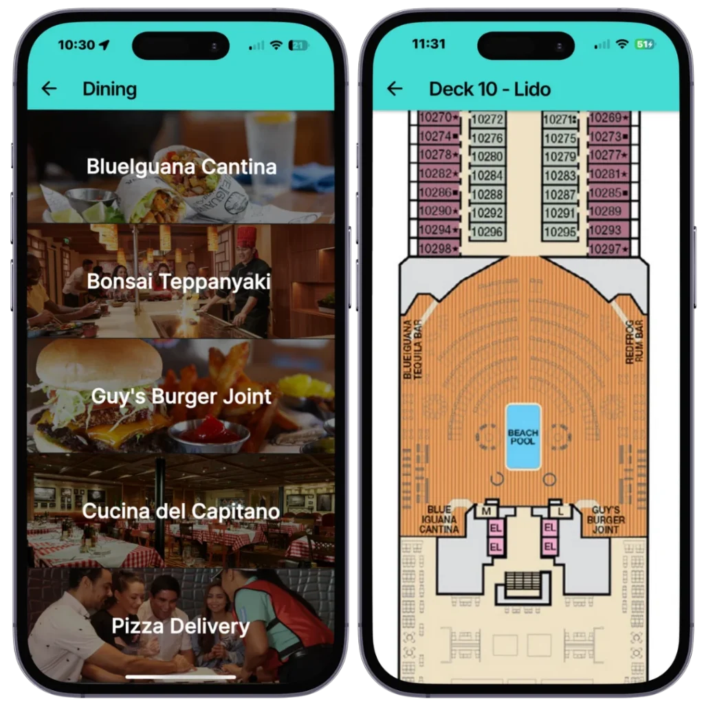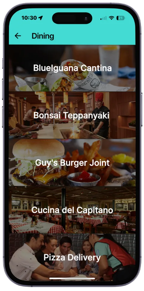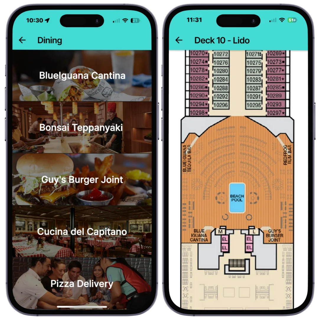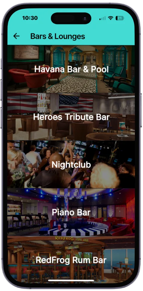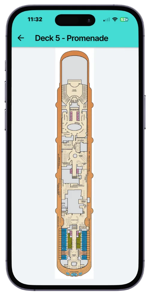 See your ship, itinerary, port days, sea days, and onboard venues at a glance. DeckMate turns your sailing into an interactive timeline that’s easy to explore.