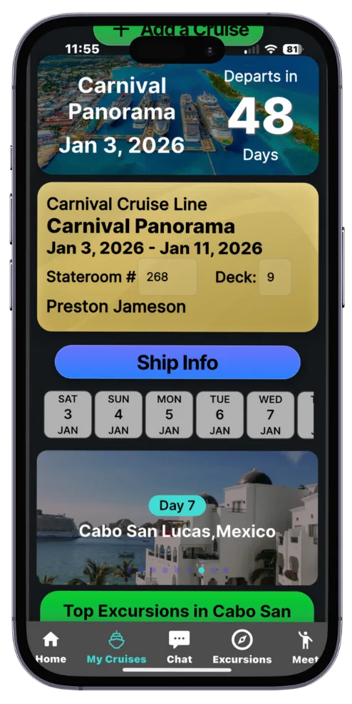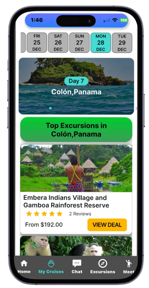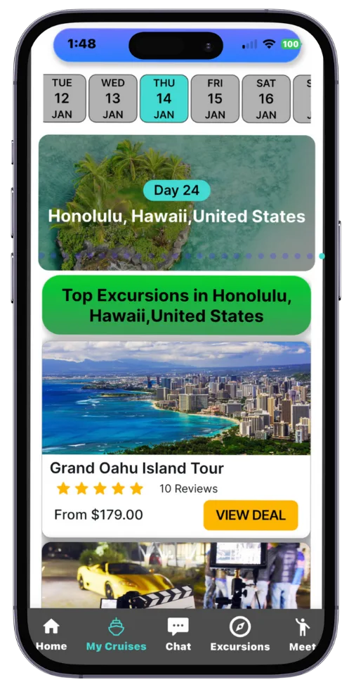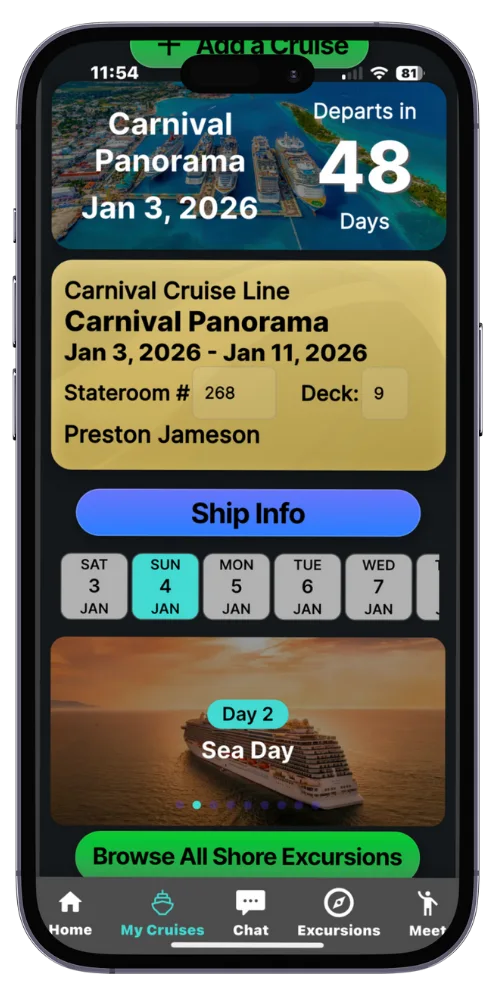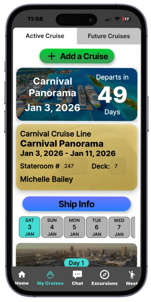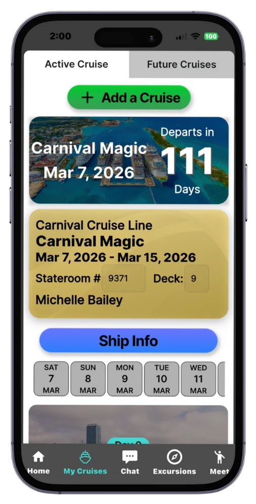 See your ship, itinerary, port days, sea days, and onboard venues at a glance. DeckMate turns your sailing into an interactive timeline that’s easy to explore.