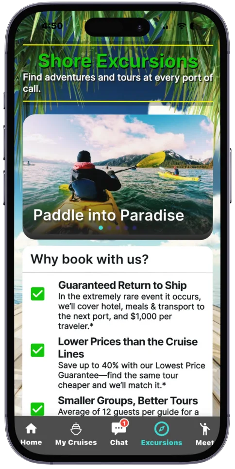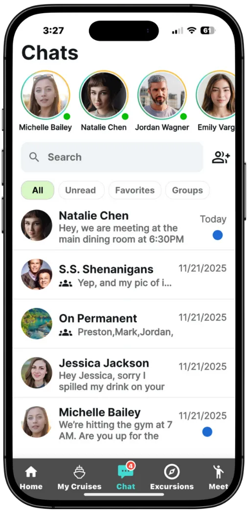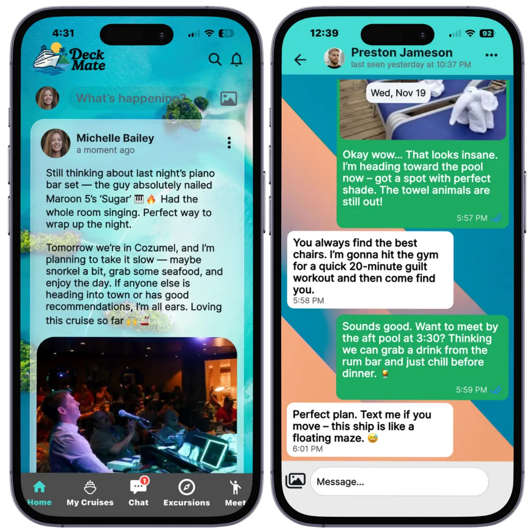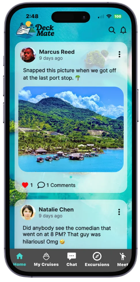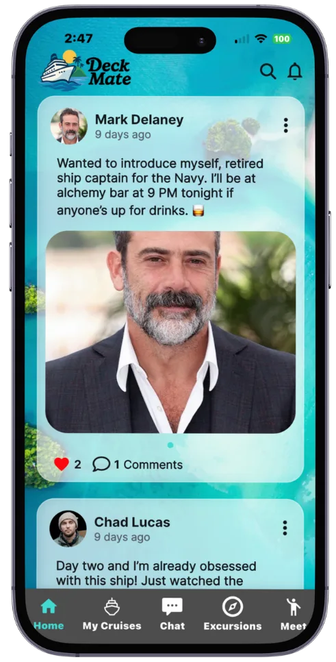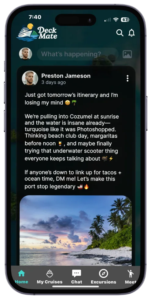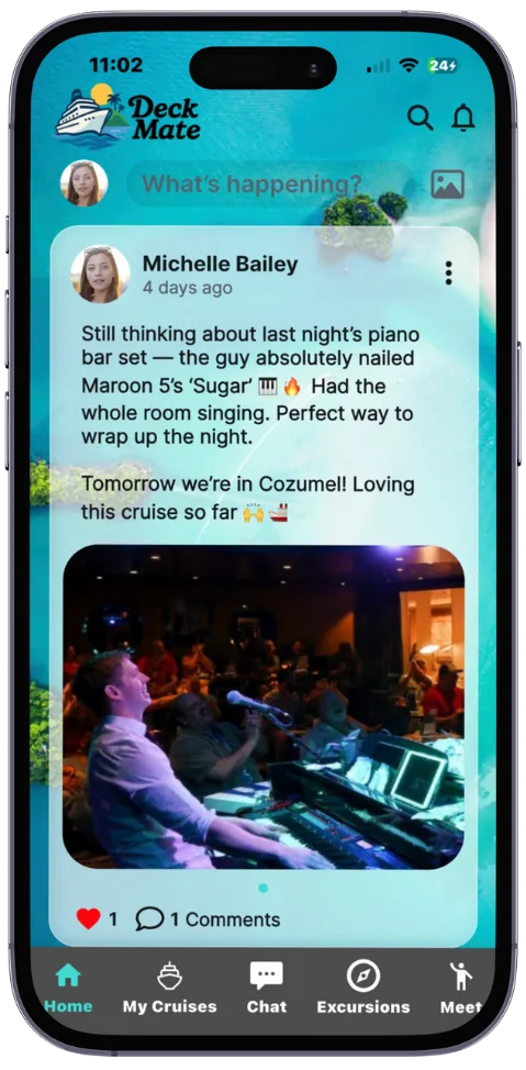 DeckMate makes it easy to connect with fellow travelers on the same sailing. Share tips, start the conversation, and make your cruise more social from day one.