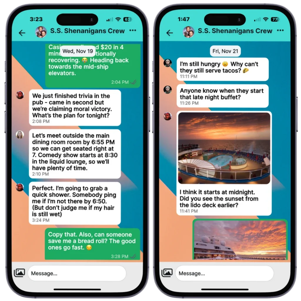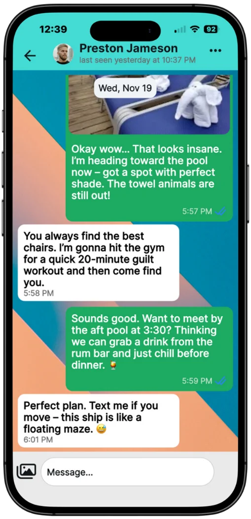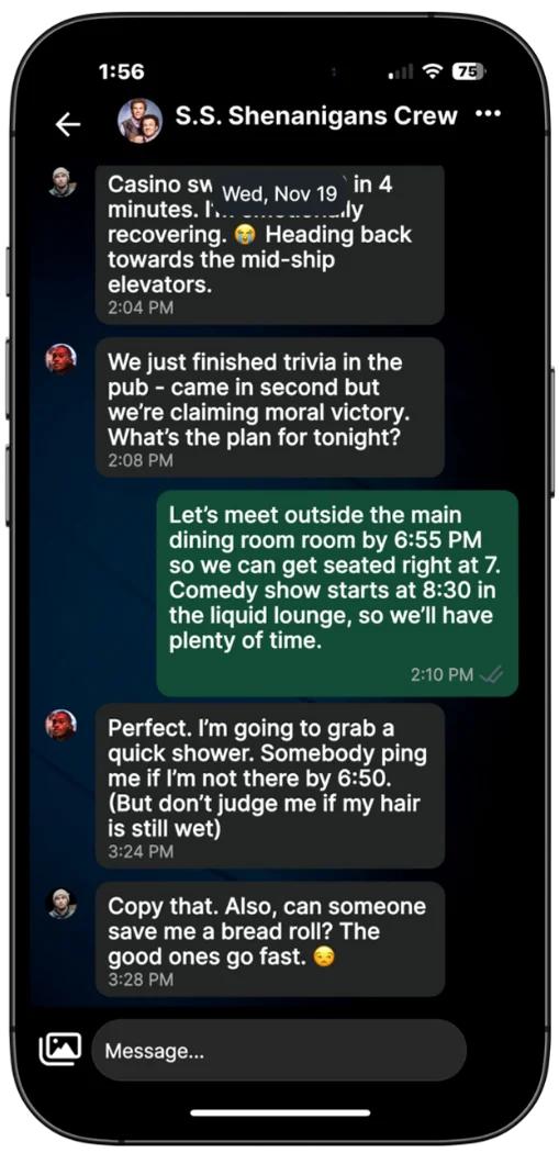 Your ship may be huge, but staying connected shouldn’t be. DeckMate gives you reliable messaging tools whether you’re relaxing in your cabin or grabbing a second plate at the buffet.