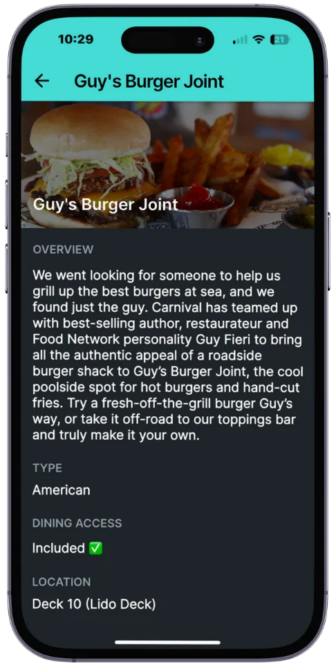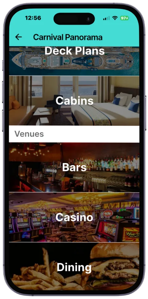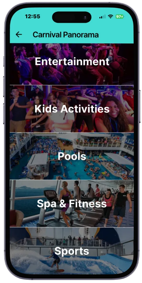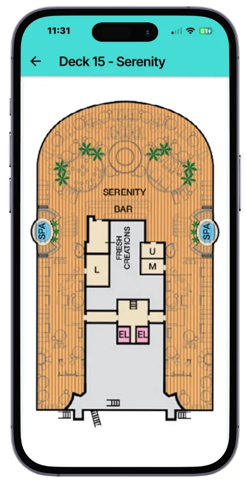 Your cruise ship is packed with hidden gems — and DeckMate helps you uncover them. See what entertainment is happening, find the best bars & lounges, check out dining options, pools, spa services, sports areas, and activities for kids. The whole ship is at your fingertips.